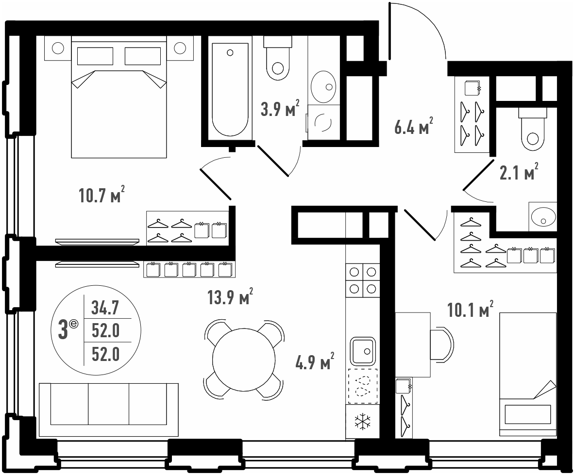 Общая площадь 52 м²