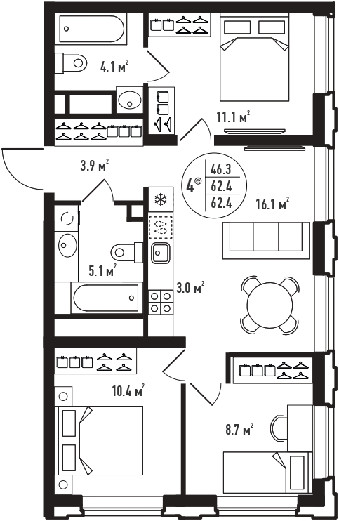 Общая площадь 62.4 м²