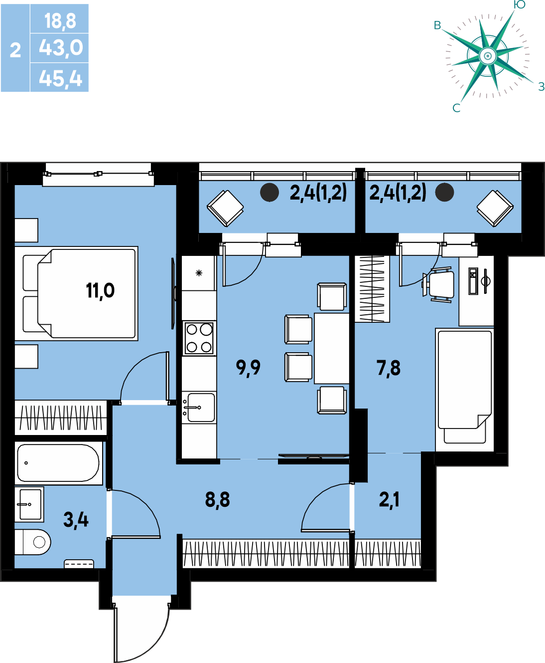 Общая площадь 45.4 м²