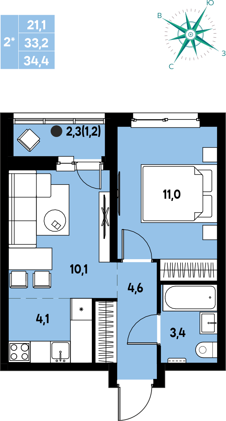 Общая площадь 34.4 м²