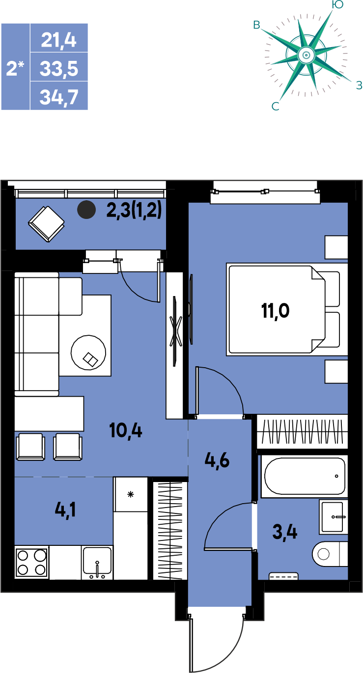 Общая площадь 34.7 м²
