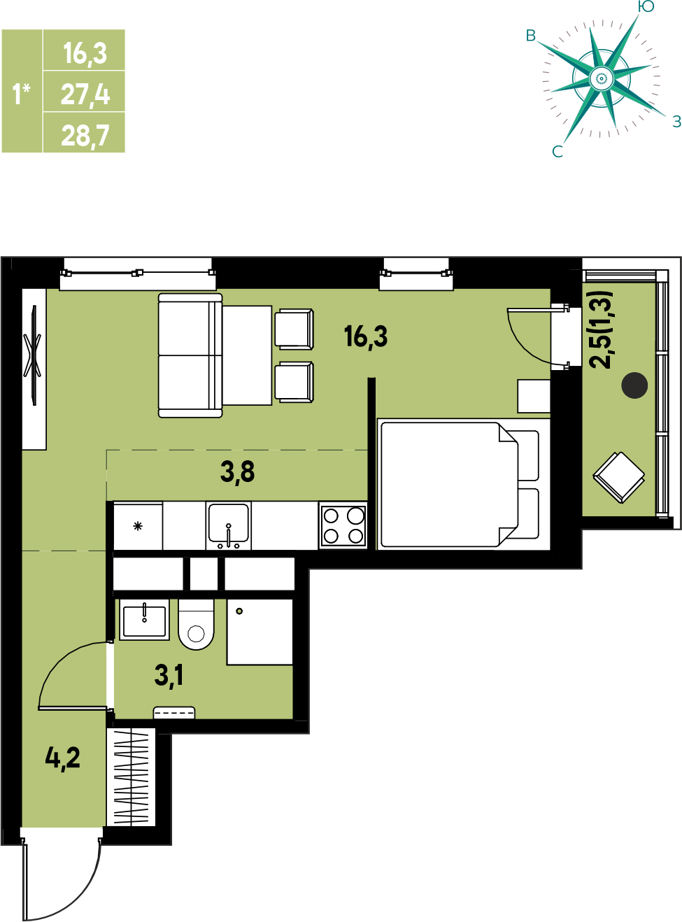 Общая площадь 28.7 м²