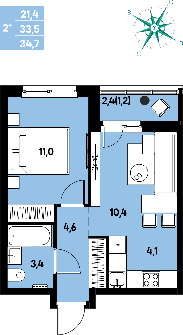 Общая площадь 34.7 м²