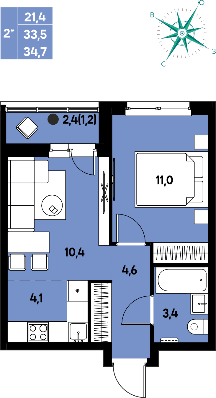 Общая площадь 34.7 м²