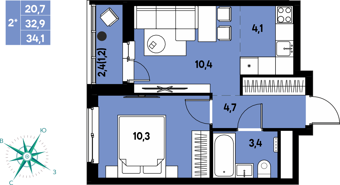 Общая площадь 34.1 м²