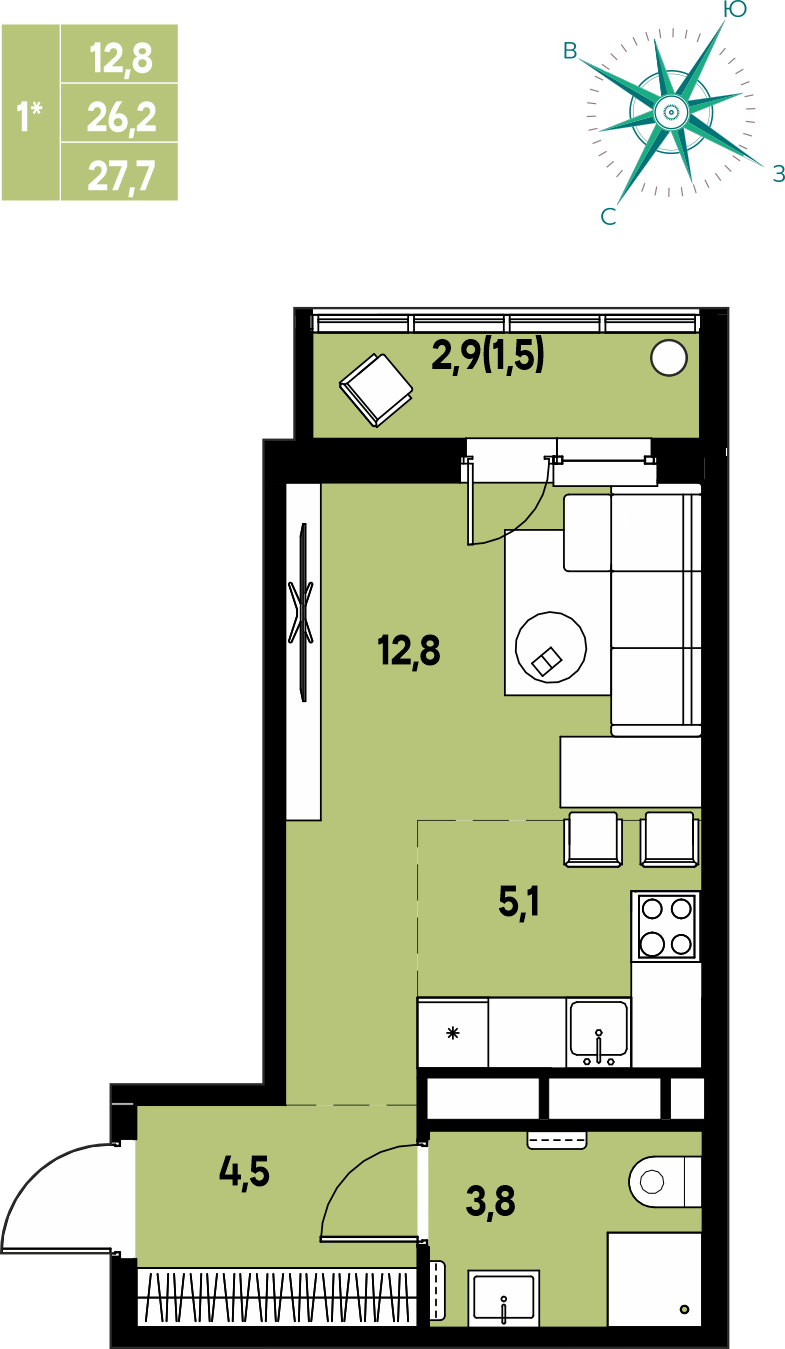 Общая площадь 27.7 м²