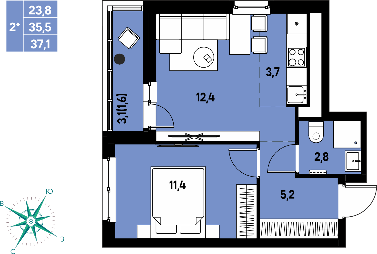 Общая площадь 37.1 м²