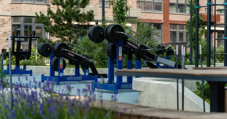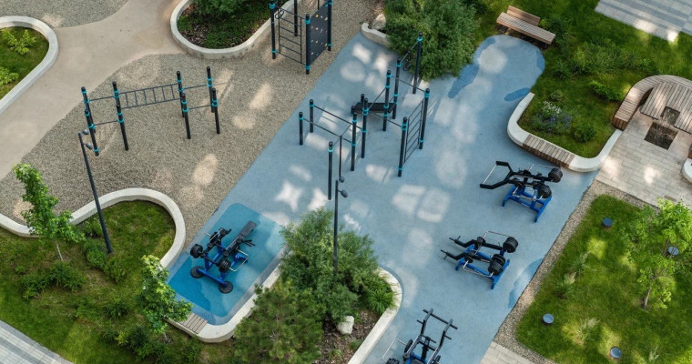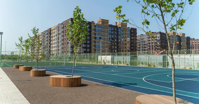 Общая территория комплекса — более 23 га. Она позволяет сохранить большое расстояние между домами, озеленить дворы и разместить детские городки, деревянные беседки, лавочки, проложить велодорожки и аллеи. И создать спортивный кластер, где есть скейт-парк, тренажеры, площадки для разных видов спорта, теннисный корт с безопасным покрытием. Велодорожки проходят параллельно аллеям по всему периметру ЖК так, чтобы маршруты велосипедистов и пешеходов не пересекались.