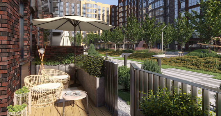 Здесь есть первые в городе квартиры с террасами на первом этаже — благодаря им вы воплотите мечту о собственном дворике, не покидая мегаполиса.