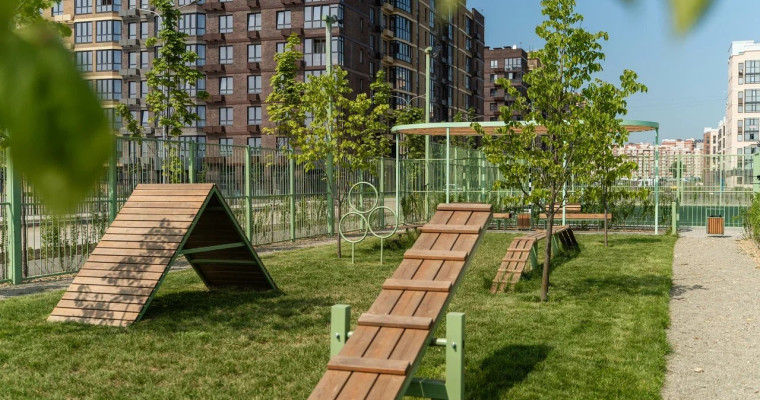Пространство второй очереди обустроено в экостиле — со множеством зеленых насаждений, зонами отдыха из природных материалов, натуральными газонами, где можно отдыхать, играть, заниматься спортом. Владельцы домашних животных могут выгуливать своих питомцев на специальной тренировочной площадке.