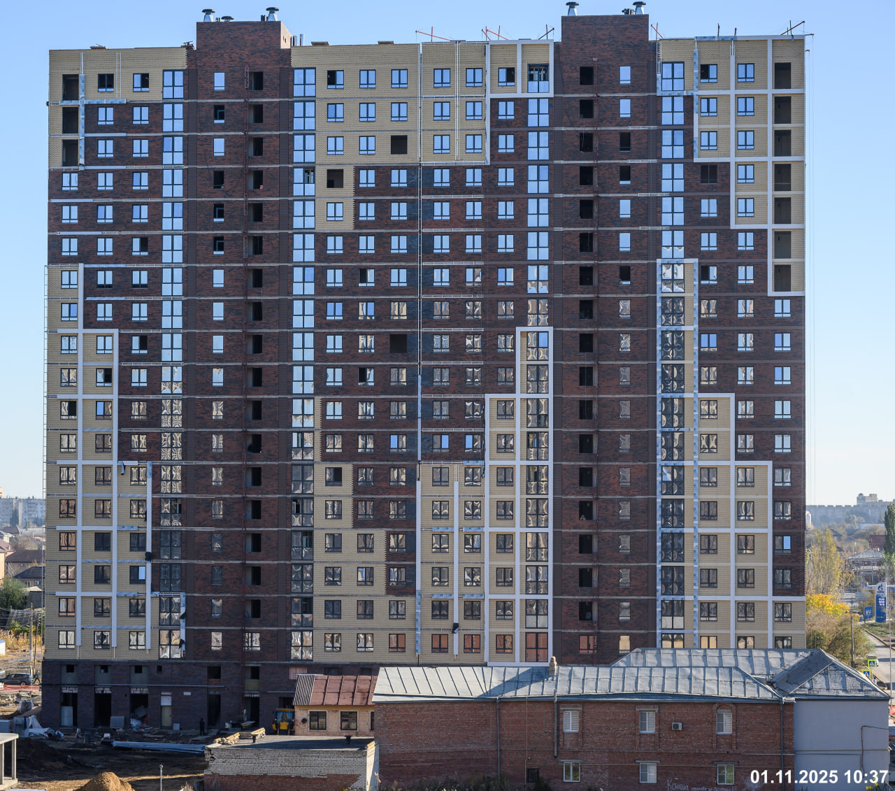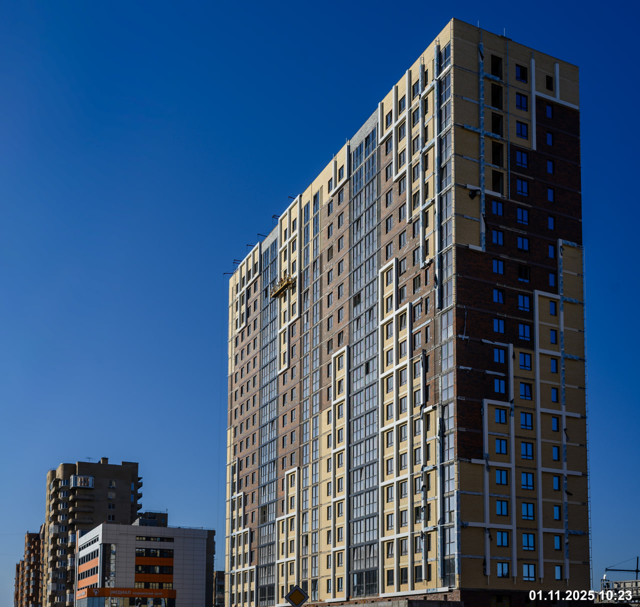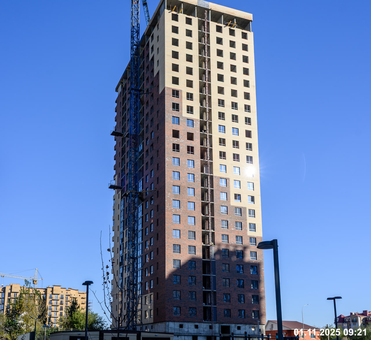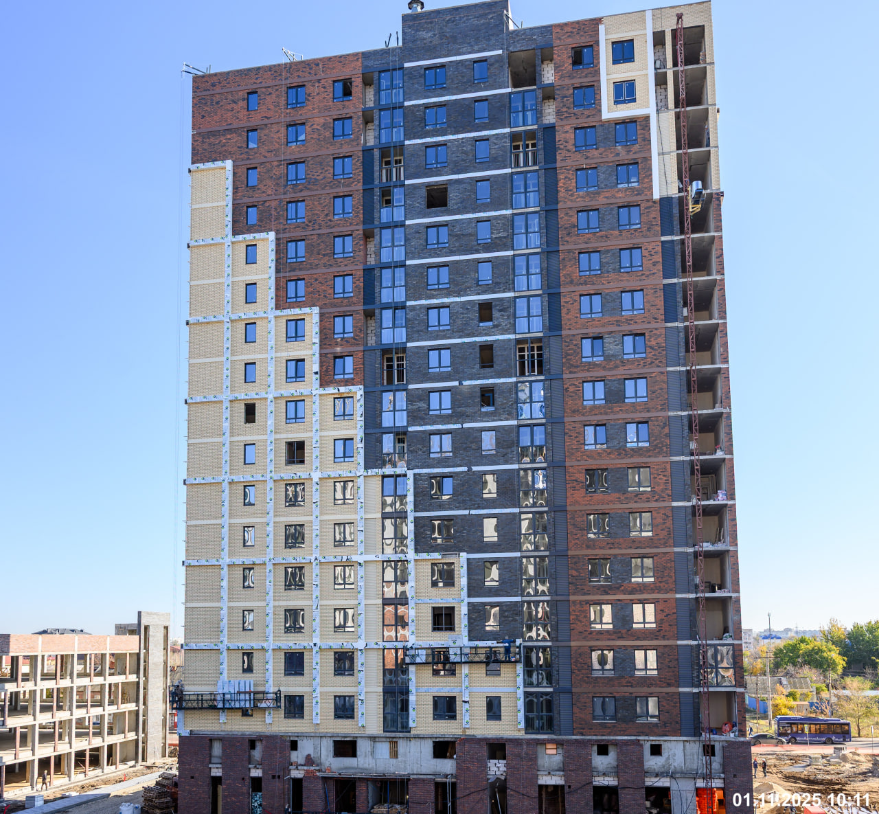 Также обратите внимание на оконный профиль графитового цвета немецкой марки Rehau и на то, какое красивое отражение дает напыление оксида серебра. Светопрозрачная конструкция делает фасад визитной карточкой нашего жилого квартала.